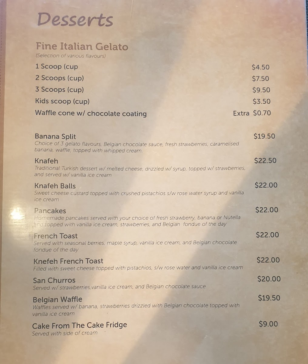 For those with a sweet tooth, the dessert selection is equally enticing. Signature items like Kismet Doughnut Indulge, Knafeh, San Churros, and Pancakes deliver a perfect balance of freshness and decadence. Coffee lovers will appreciate expertly crafted brews such as Flat White, Cappuccino, and the unique Green Tea Latte, making it a haven for every palate.